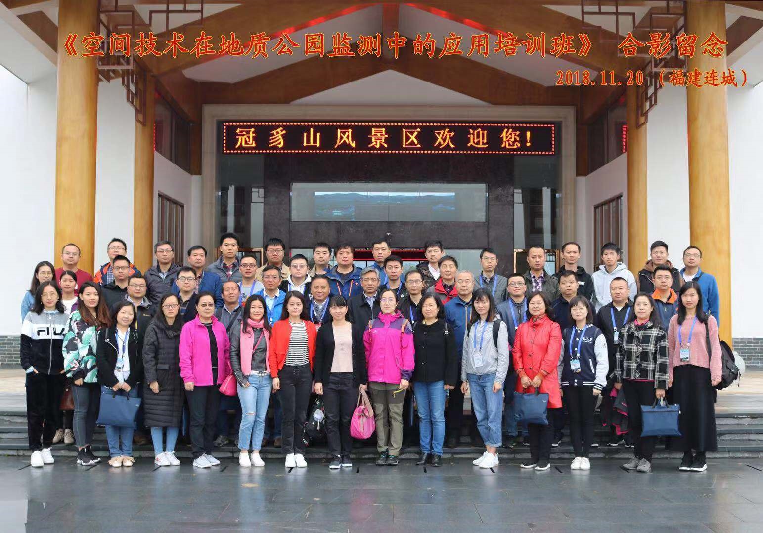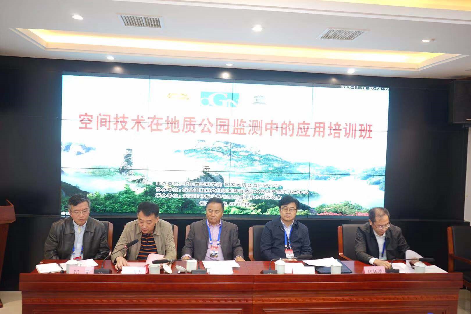 由中国地质科学院国家地质公园网络中心主办、联合国教科文组织国际自然与文化遗产空间技术中心(HIST)协办的“空间技术在地质公园监测中的应用”培训班于2018年11月18-21日在福建龙岩连城县举行。中国地质科学院副院长、国家地质公园网络中心主任何庆成,中国地质科学院地质力学研究所名誉所长、李四光纪念馆馆长龙长兴,HIST常务副主任、秘书长洪天华,福建龙岩冠豸山管委会主任杨晓春,福建龙岩世界地质公园申报办公室主任邱桥荣等出席培训班开班式并讲了话。培训班由中国地质科学院国家地质公园网络中心办公室郑元主任主持,共有黄山、泰山等世界地质公园35名学员参加了培训。