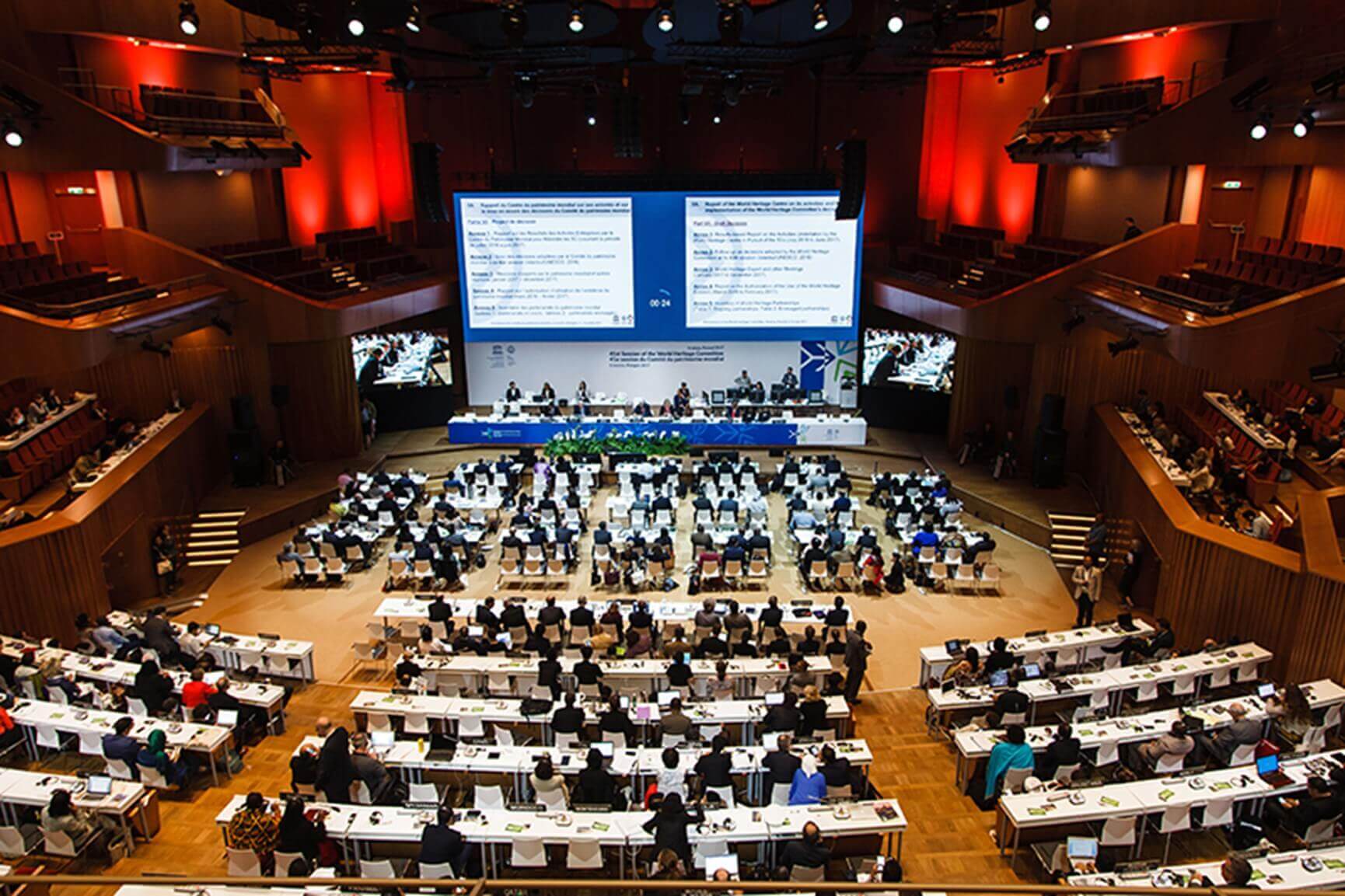 世界遗产大会是联合国教科文组织世界遗产委员会的例会,每年召开一次,首届大会1977年在法国巴黎举行。大会的主要职责是审核、批准新申报项目入选世界遗产名录,并对已列入名录的世界遗产的保护工作进行监督指导。