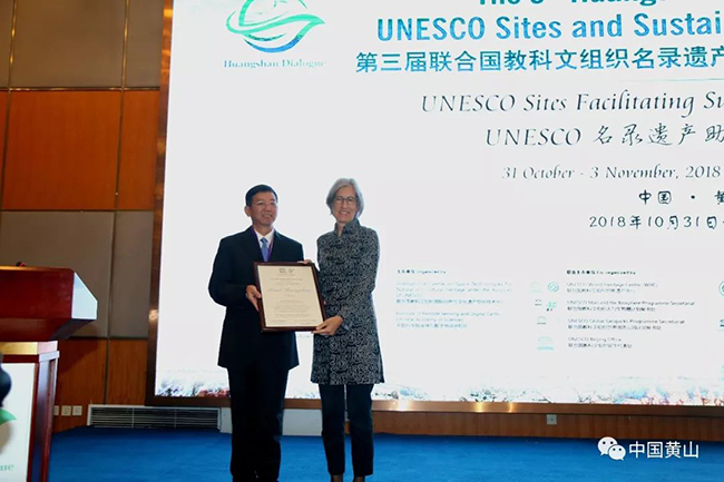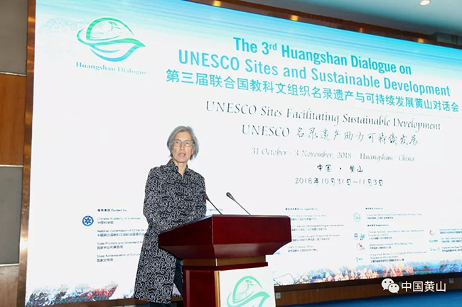 施莱格首先对黄山今年成功加入世界生物圈保护区表示祝贺。她说,MAB(人与生物圈)计划将经济、社会和环境方面结合起来,在所有方面实现了可持续发展;同时,教科文组织世界地质公园也可以被视为最佳实践范例和联合国17项可持续发展目标的灵感源泉。目前中国已拥有的37处世界地质公园,每一处的开发都因地制宜,与当地文化和特定的社会经济背景相适应。作为联合国教科文组织的“三冠王”,希望黄山继续开展各项教科文组织指定计划(生物圈保护区、世界遗产地、教科文组织世界地质公园)的互补性活动,共同支持《2030可持续发展议程》的实施。