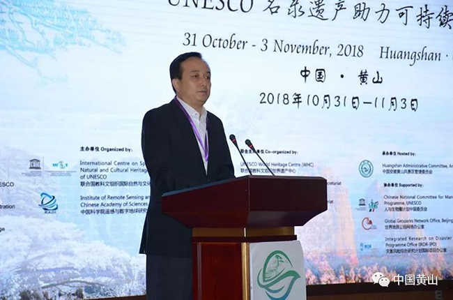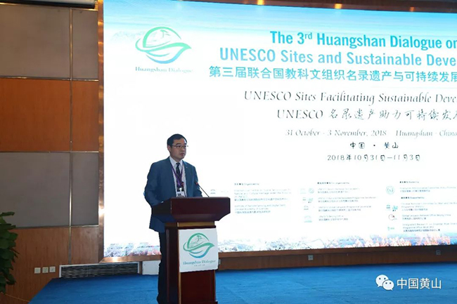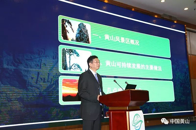 市委常委、黄山风景区党工委书记、管委会副主任吴文达作题为《黄山名录遗产地可持续发展探索与实践》报告·蔡季安 摄