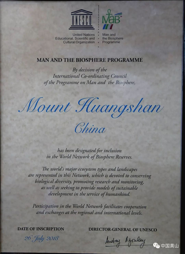 黄山世界生物圈保护区证书原件·蔡季安 摄