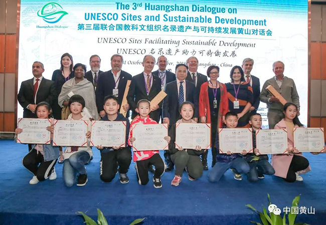 黄山市中小学生代表向UNESCO和相关机构官员、专家赠送了中国传统书画作品,孩子们通过书画作品,表达了他们对家乡、对黄山、对大自然的热爱。