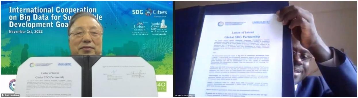 此次会议作为2022年世界城市日全球主场活动暨第二届城市可持续发展全球大会的主场边会之一,由联合国人居署、SDG中心和中国21世纪议程管理中心共同举办。SDG中心主任郭华东院士与联合国人居署数据与分析部门主任Robert Ndugwa博士在线签署CBAS全球SDG伙伴关系合作意向书。