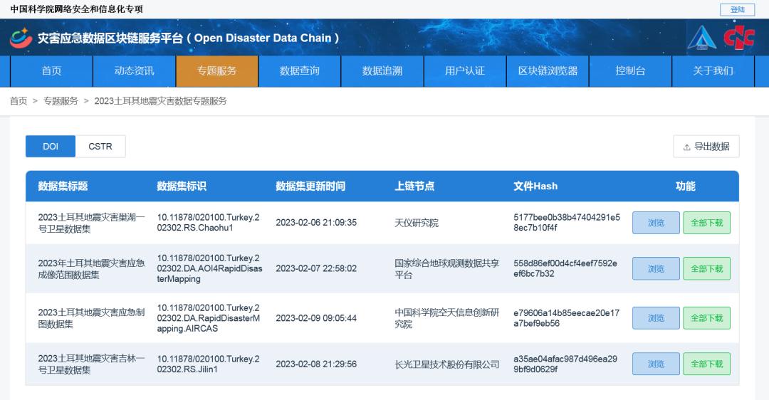 图3 2023土耳其地震灾害数据区块链专题服务(https://disaster.opendatachain.cn/service/TurkeyEarthquake2023)(中国遥感卫星地面站 张连翀团队提供)