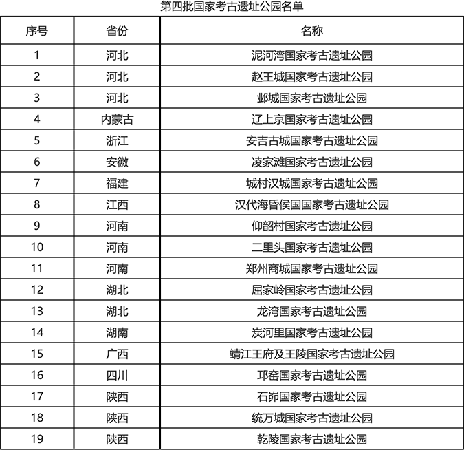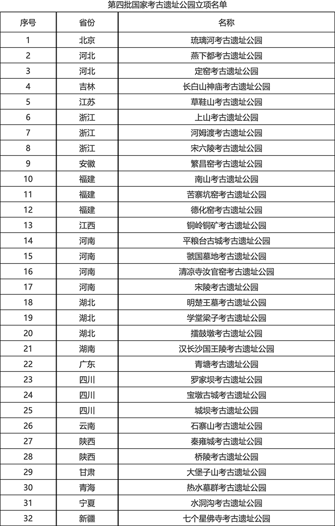 根据《国家考古遗址公园管理办法》等有关规定,我局组织开展了第四批国家考古遗址公园评定工作。根据材料审核、现场考察和专家评议等情况,经国家文物局党组会议研究决定:泥河湾等19处考古遗址公园列入国家考古遗址公园名单,琉璃河等32处考古遗址公园列入国家考古遗址公园立项名单(附后),现予公布。