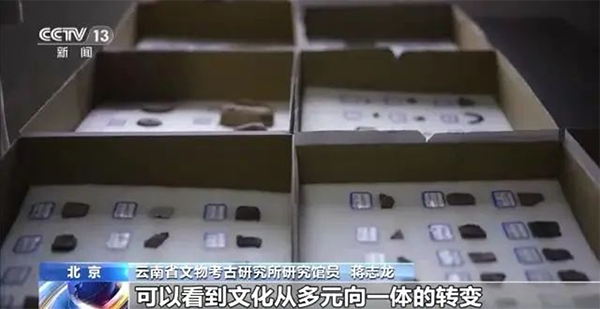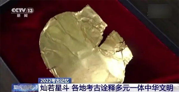 云南省文物考古研究所研究馆员 蒋志龙:简牍可以跟封泥相互印证,显示西汉时期我们中央政府对云南进行了有效的管辖,可以看到文化从多元向一体的转变。从边疆到中原,从史前人类遗存,到统一多民族国家繁荣发展,通过考古,在中华大地上发现的处处文化遗迹,彰显出中华文明如星斗般灿烂。2022年的考古,在河南郑州商都书院街商代墓地,出土青铜礼器兵器以及玉器、金器、贝币等各类器物200多件,特别是一件重约40克的“金覆面”,含金量高达88%,对寻找三星堆等我国西南地区出现的黄金面具、黄金装饰来源,提供了新的参照材料。