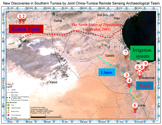 突尼斯南部遥感考古新发现10处遗址点:1、2 为军事堡垒(Forts),3、4、5为边墙(Limes),6、7、8为水窖,9为农业灌溉系统,10为墓葬。