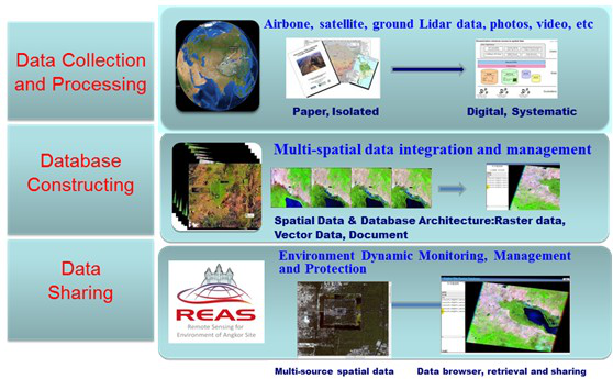 目标:构建吴哥科学、系统的多源空间信息数据库,主要内容包括:吴哥遗址多源空间数据收集;吴哥遗址多源空间数据规范处理研究,标准化系列空间数据产品处理技术研究。
