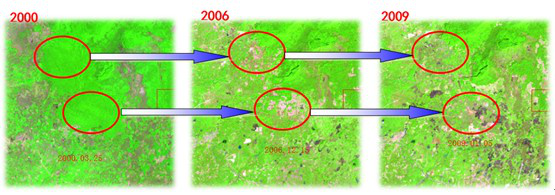 进展:完成了1985-2003年共9景(或时相)遥感影像的吴哥遗产地土地利用/土地覆盖分类(图3),并对分类结果进行了统计分析(图4);完成了森林面积动态分析(图5),图6为森林变化的遥感影像实例。